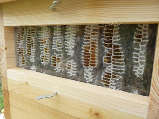 Ja ďakujem Ivanovi za uznanie, perfektnú komunikáciu, spoľahlivosť a vrelé jednanie. Mám radosť, že sa včielkam darí. Pozorovanie cez okienko ich neruší, to len idú za svetlom. A ten postavený plást nemôže byť dlhší ako 20 cm, pretože v pokračovaní stavby včielky zastavia trámiky v spodnom nadstavku, kde budú v stavaní prírodného diela pokračovať až keď vystavajú horný box. Včely treba prikrmovať sirupom 1:1, treba im dať aspoň 4 kg cukru keď už nie je znáška. Nech si dostavajú dielo a urobia minimálne zásoby. Špunty v strieške treba vybrať, tie štyri očká tam musia byť otvorené celoročne. Včely na letáči sú strážna služba, kontrolujú vchod do úľa. Sú teplé dni aj noci a musia vetrať. Úľ je živá odparka, musia zahustiť donesený nektár na 80 % sirup. Preto musia zabezpečiť výmenu vzduchu v úli. Včelám nie je zima, nezamrznú, zima a mráz im neškodí, škodí im vlhkosť a tú treba z úľa odvádzať.